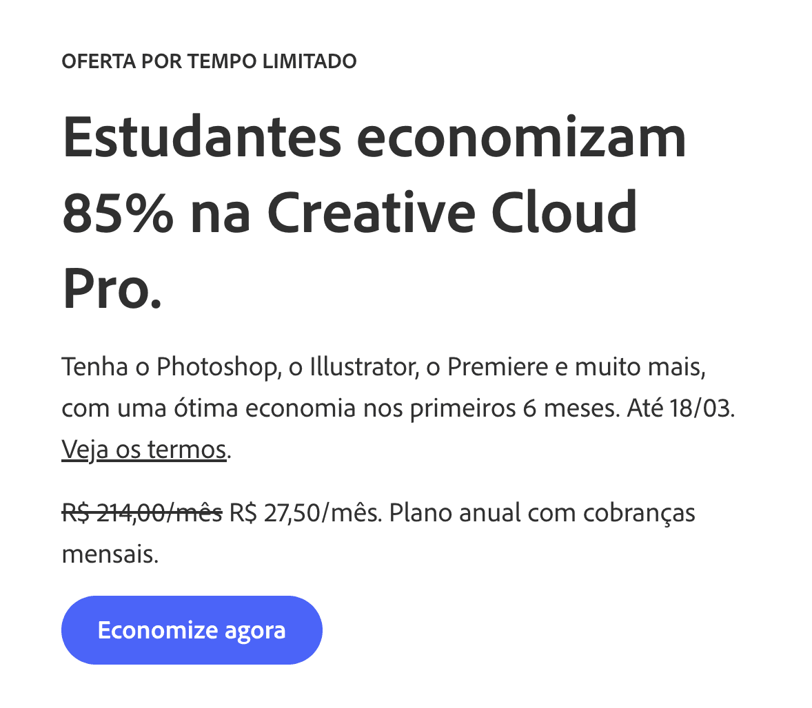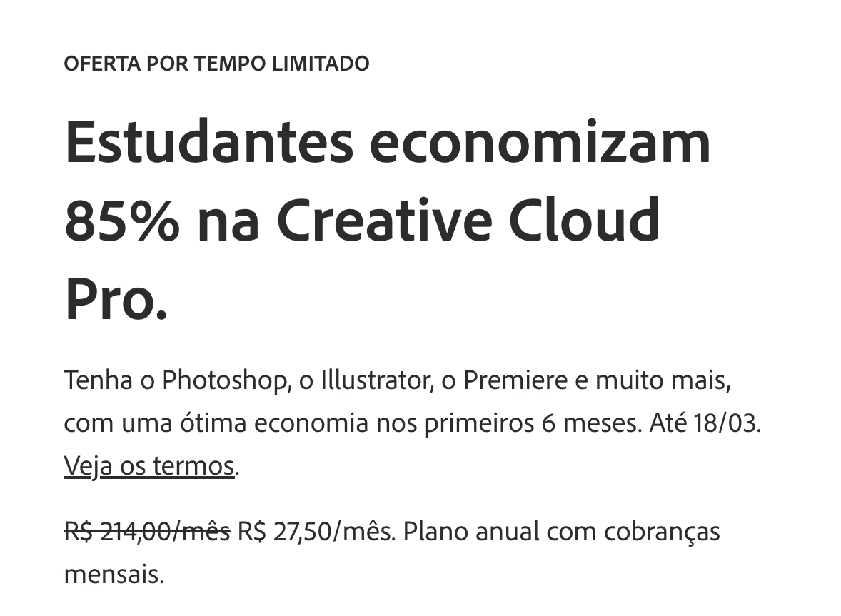 Clique no botão ABAIXO e assine a Adobe pelo preço de estudante (R$ 80,00/mês).